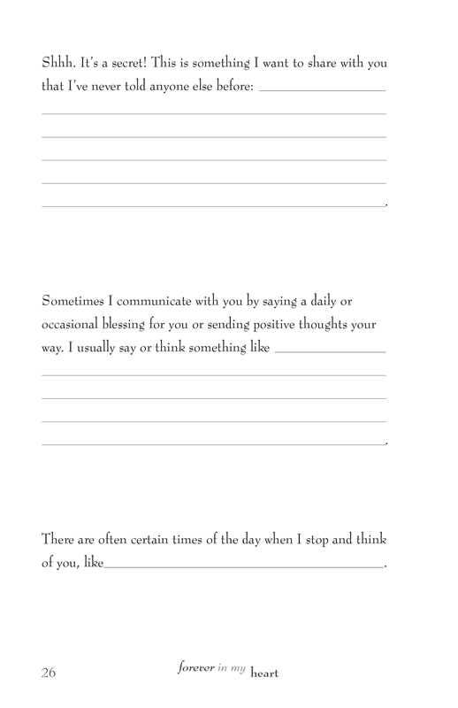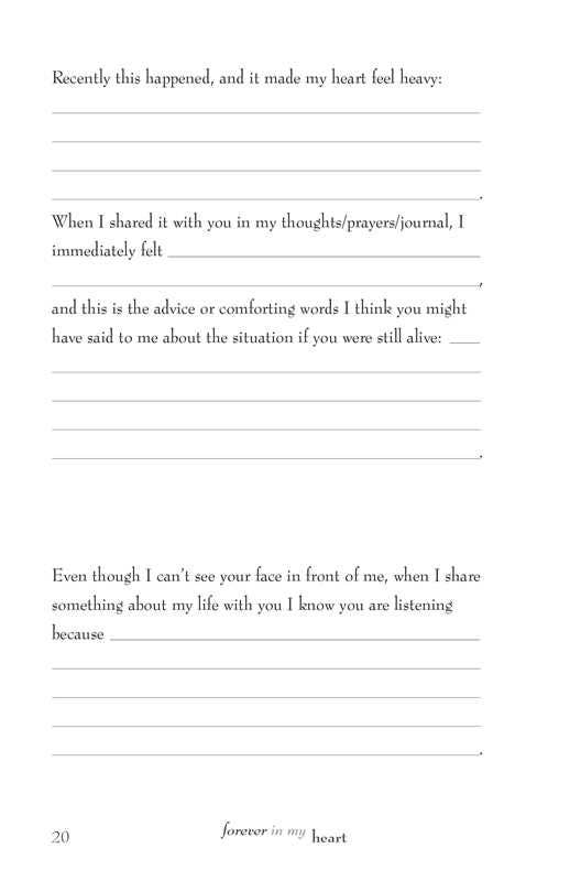 Filled with touching and inspiring prompts, Forever in My Heart is a comforting journal for recording your reflections on your loved one's extraordinary life, their unique traits, and all the many experiences and traditions you shared. This journal will help you explore your emotions, say things that were left unsaid, connect with your loved one's spirit and find healing through writing. It also includes pages to scrapbook photos and other treasured mementos.