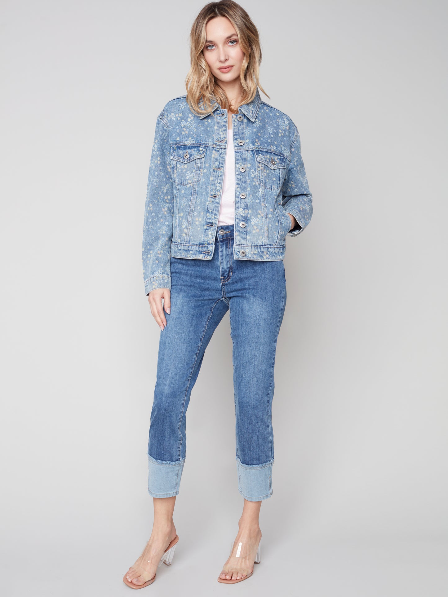 Printed Denim Boyfriend Jean Jacket With Long Sleeves And Front Pockets