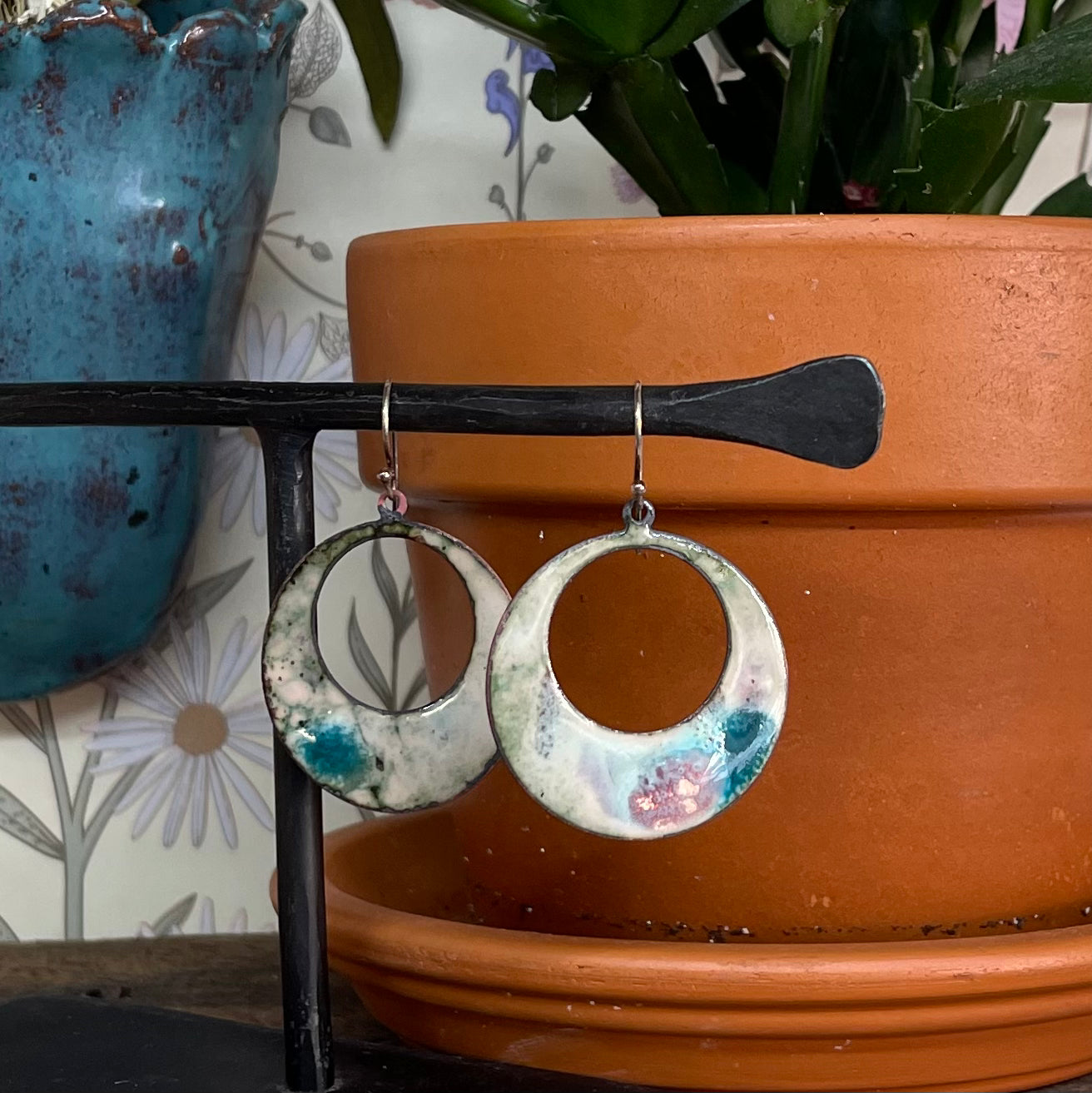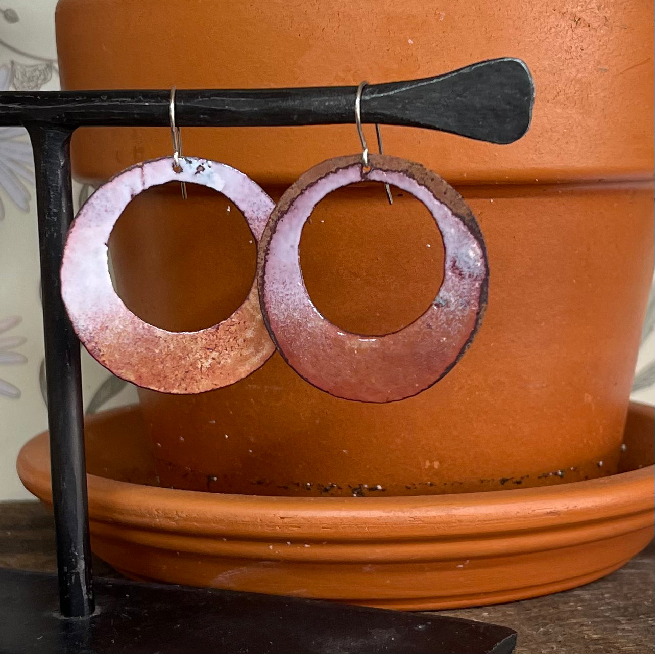 I start the process with a glass compound consisting of quartz sand, iron oxide, potassium oxide, and borax, which together are colorless. Depending on the various metal oxides and chlorides a wide range of colors are created. I fire each piece to a precise temperature until the enamel melts and fills the space it's in, becoming shiny. The piece is taken out to cool, and then polished with a carborundum file. I work with both copper and silver. Copper gives the piece a rustic handcrafted appearance that works well with any style formal or casual.