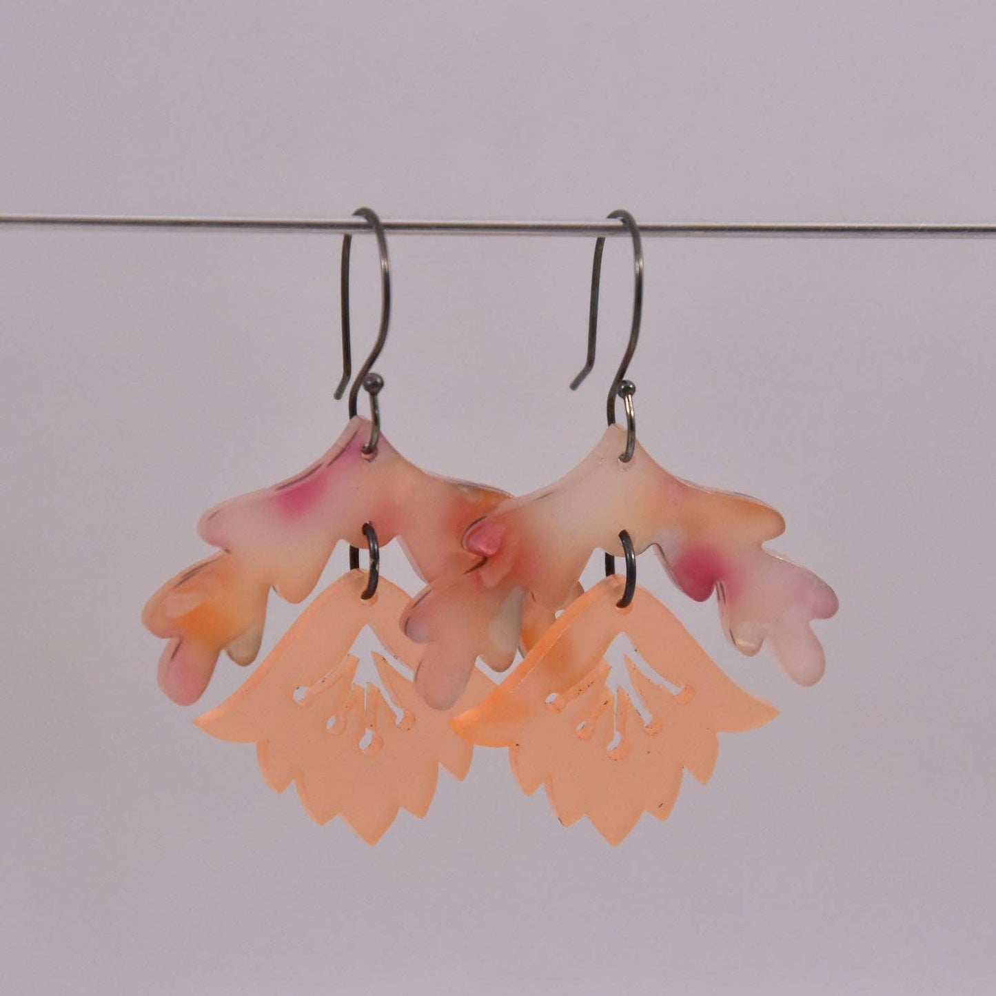 Leaf and Flower Tropical Orange Acrylic on Oxidized Sterling Silver Hooks