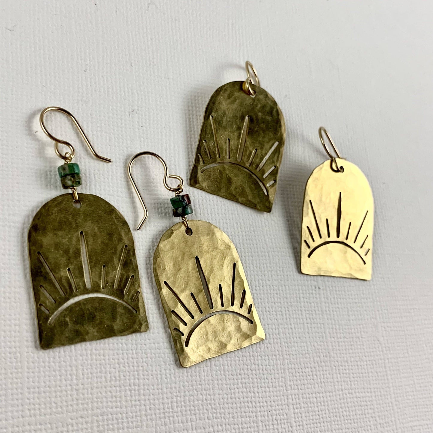 Brass sun design with jasper beads for adornment. Hangs off of 14k gold-filled or sterling silver ear wire.
