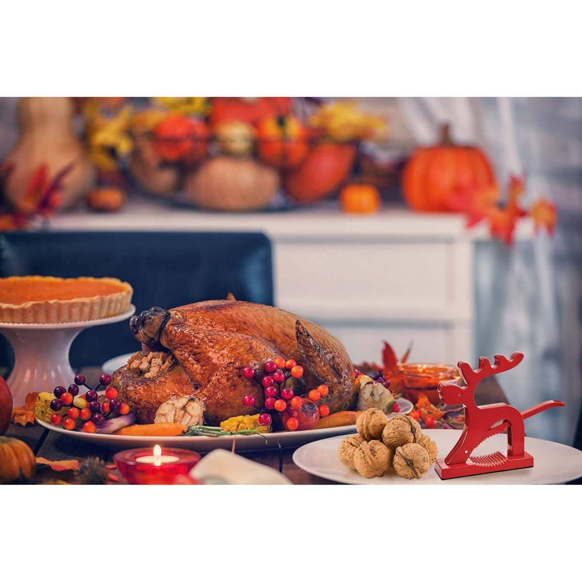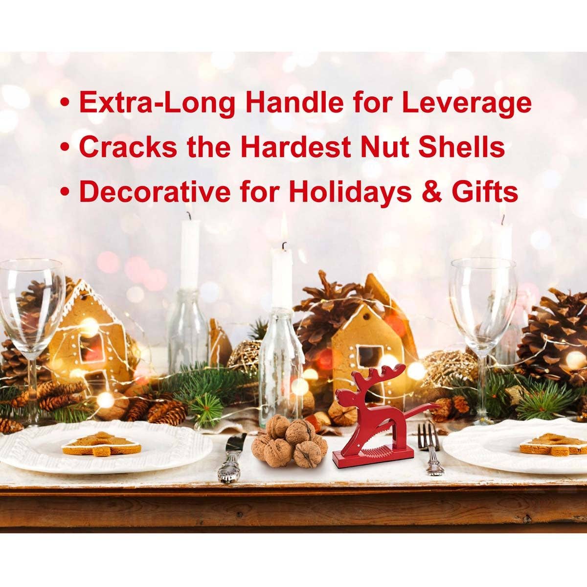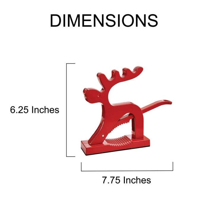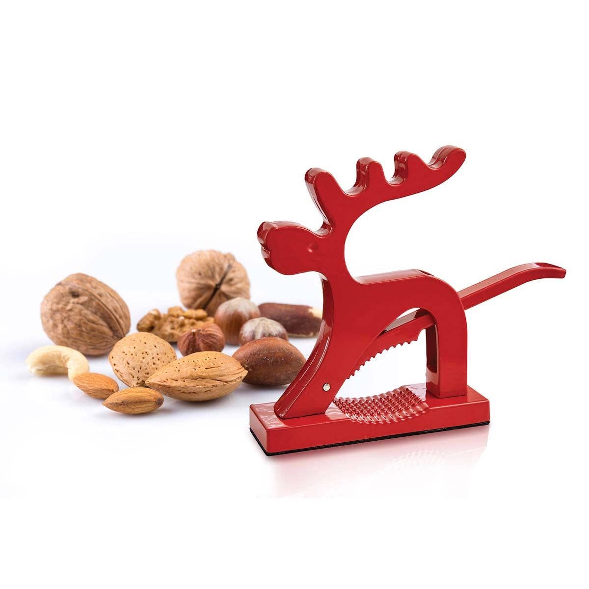 Kitchen's Reindeer Nutcracker brings festive fun to holiday traditions at home and year round. With an extra-long lever, this whimsical fellow offers plenty of leverage to effortlessly crack the hardest nut shells and free the delicate meat inside without it becoming damaged. It easily opens almonds, walnuts, pecans, brazil nuts, filberts, hazelnuts, and other types of nuts (from 0.5-inch to 1.5-inch in diameter). Simply raise the lever, place a nut in the well, and press the lever downward to crack the shell. This kitchen gadget prepares ingredients for holiday baking and meals, and makes a festive display on the counter, dining table, and party buffet for entertaining.
