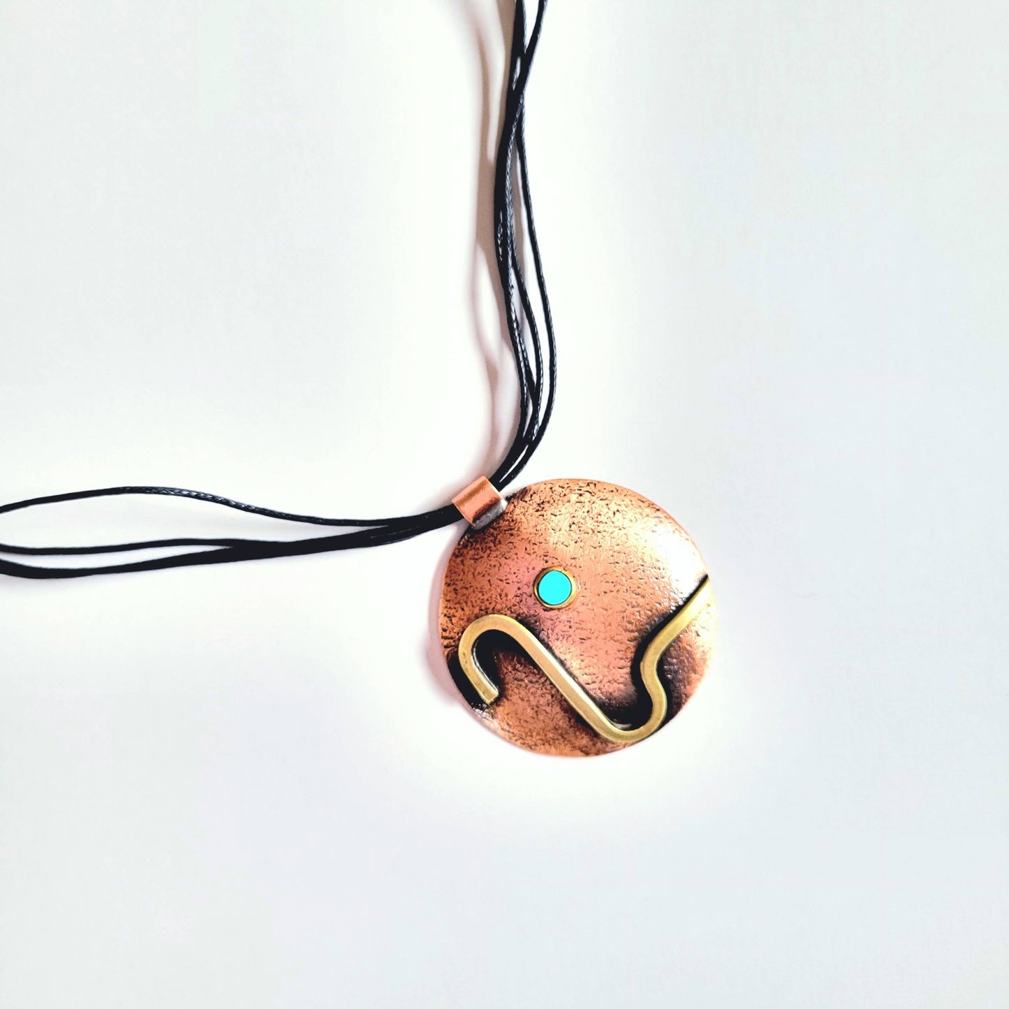 Copper, brass, and turquoise 20" multi strand cord necklace with lobster claw closure. Minor imperfections and variations are to be expected as a characteristic of the artistry.