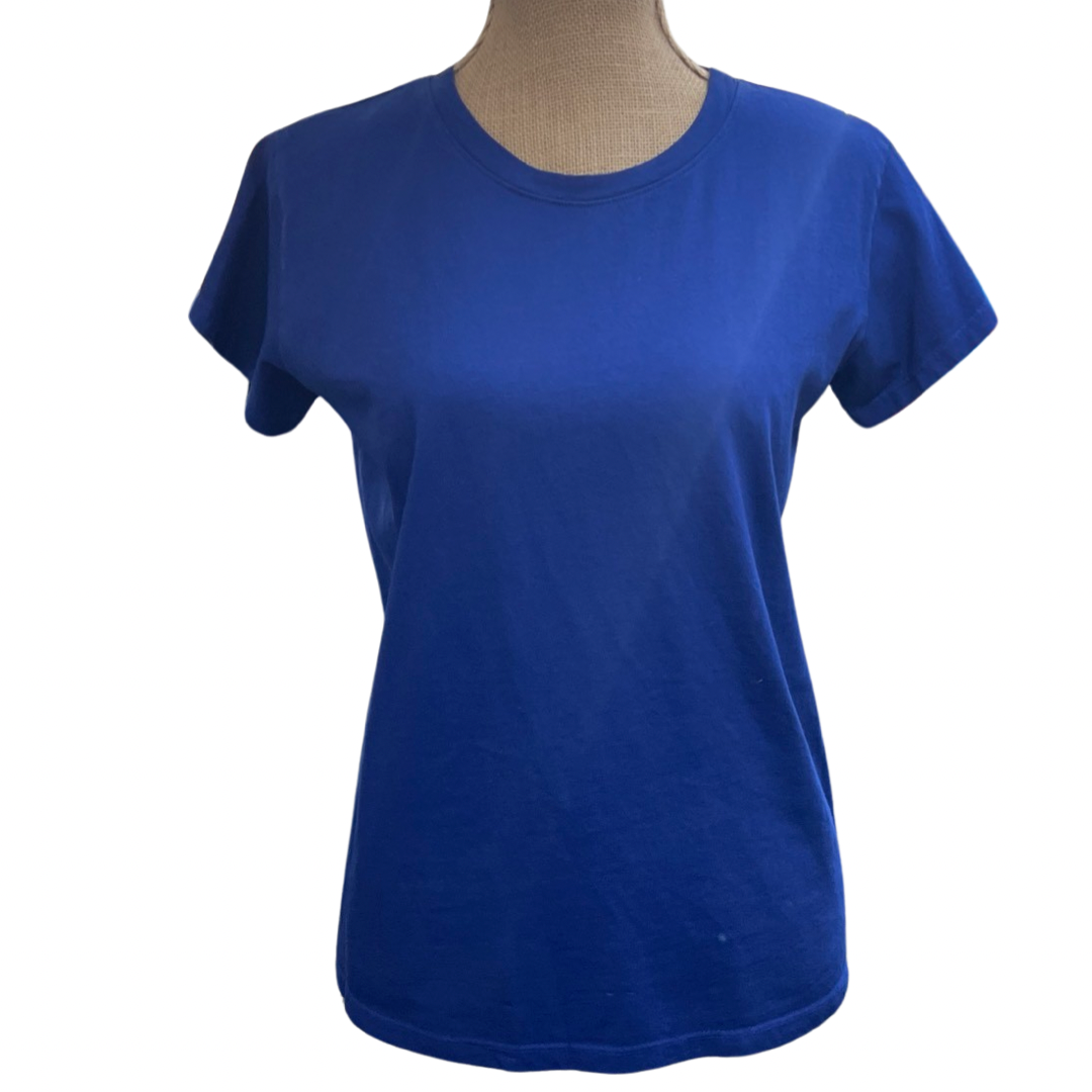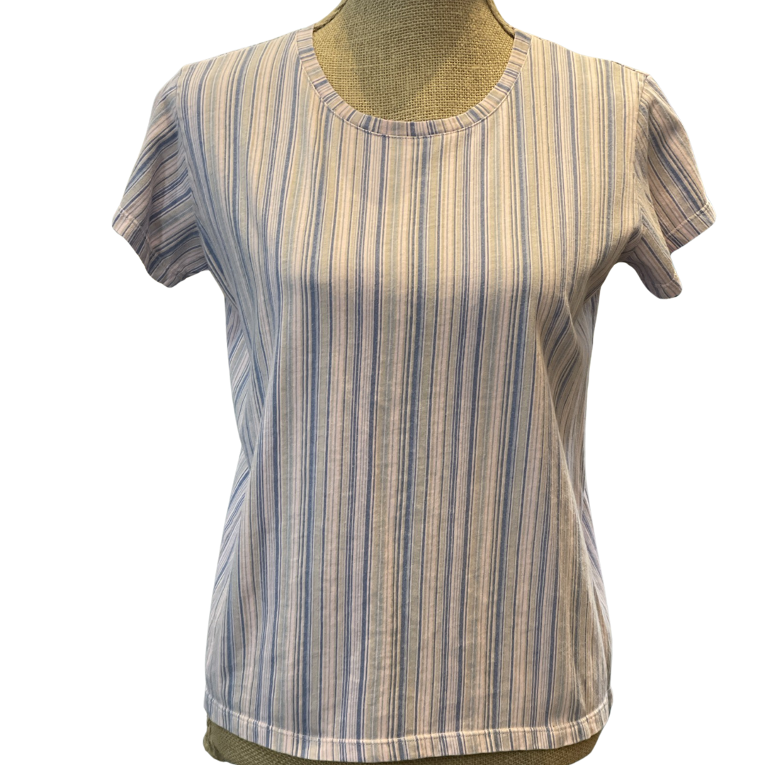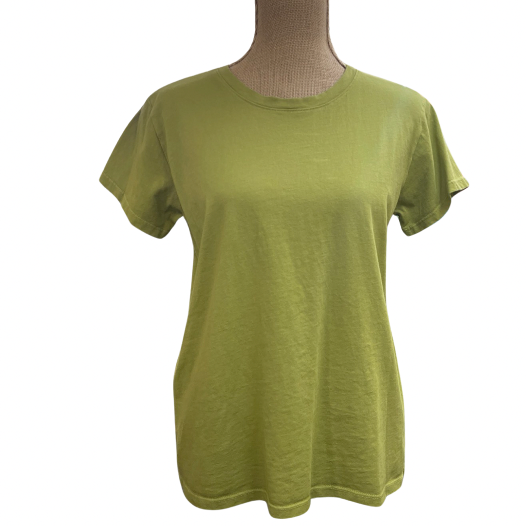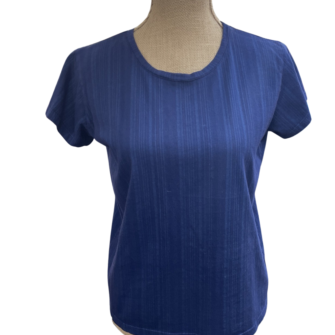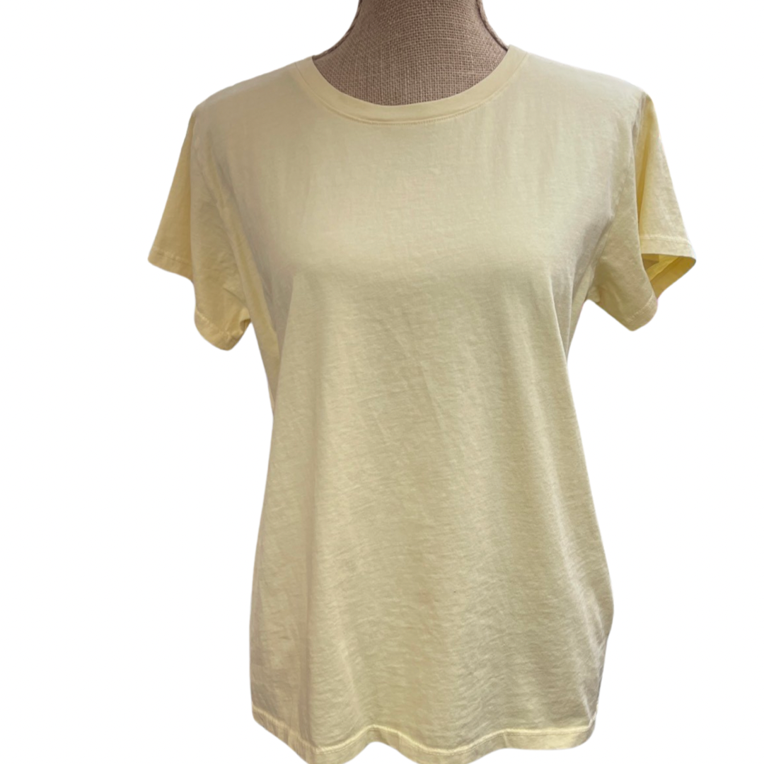 100% Cotton - American made. Gentle rounded crew neck, short sleeve tee shirt. Layers well for four season wear. Does not shrink, true to size.