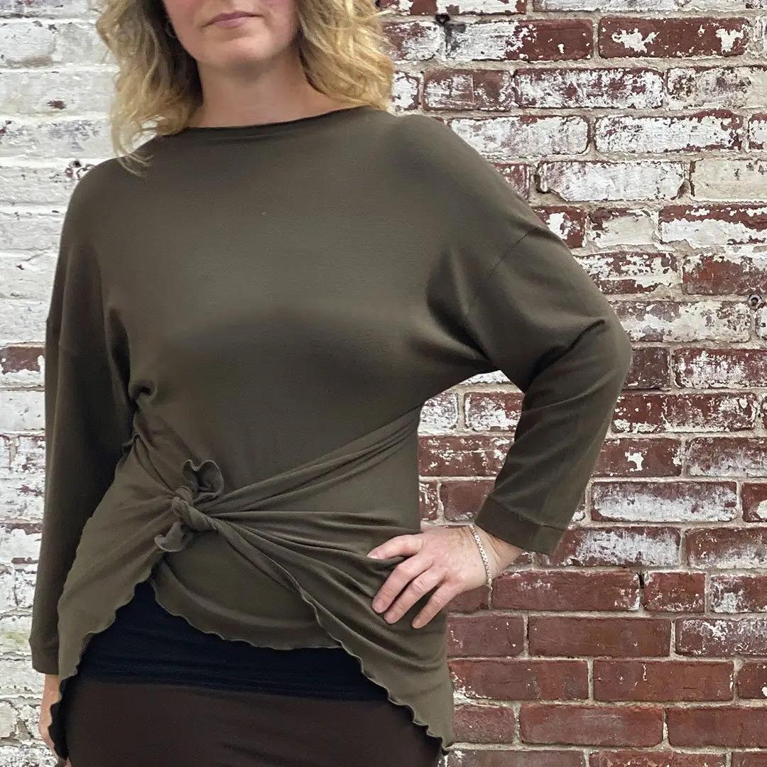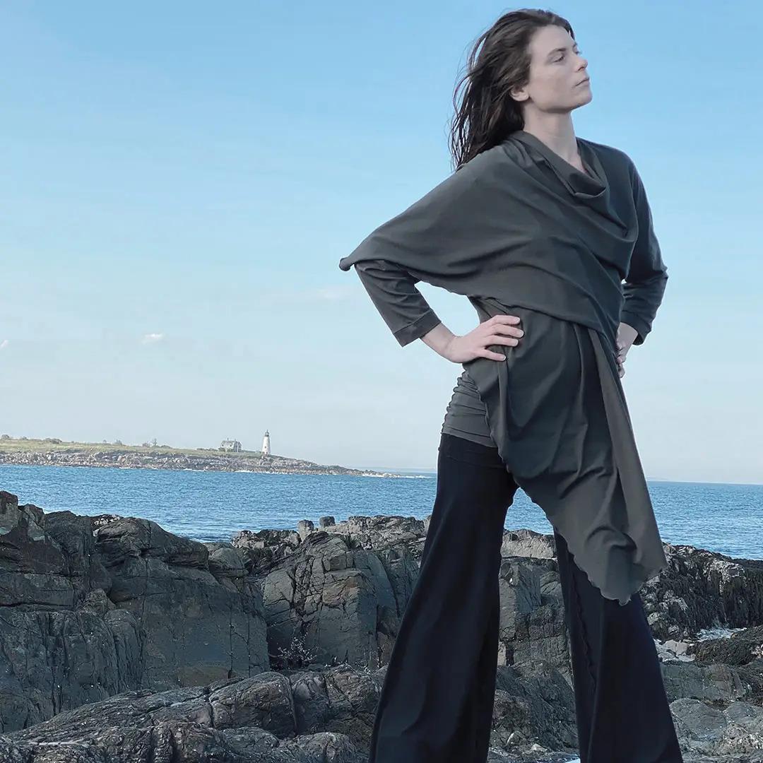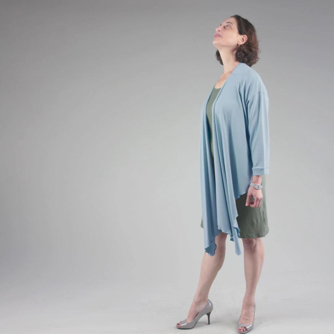 One size fits most with generous sleeves to work beautifully on sizes 0-18. Crafted with joy in Maine from sustainable, plant-based stretch knits. The prima can be worn open in front or front-to-back.