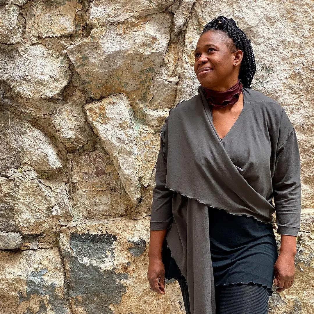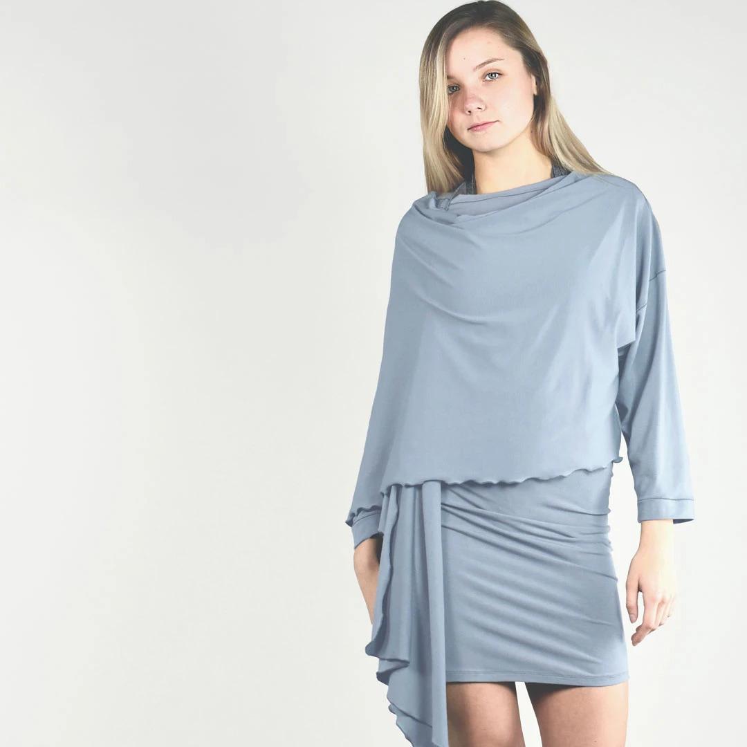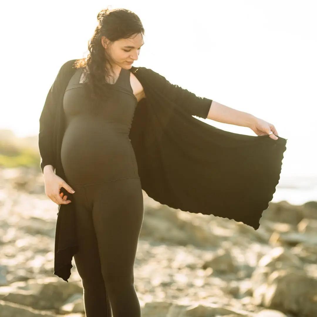 One size fits most with generous sleeves to work beautifully on sizes 0-18. Crafted with joy in Maine from sustainable, plant-based stretch knits. The prima can be worn open in front or front-to-back.