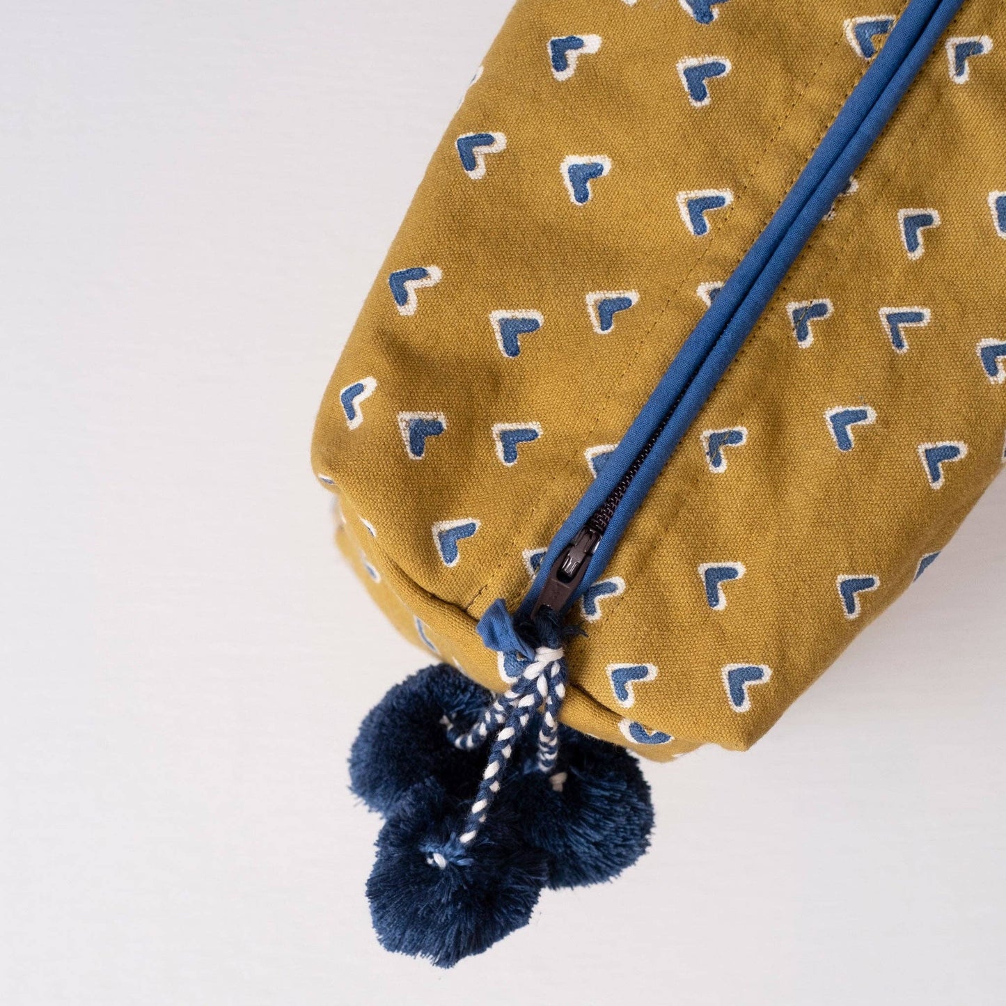 Hand-block printed with non-toxic, AZO-free dyes, and featuring hand-tied pompoms made by a 4th generation tassel-tying family in Rajasthan. Designed in our studio, hand block-printed in Jaipur, India.