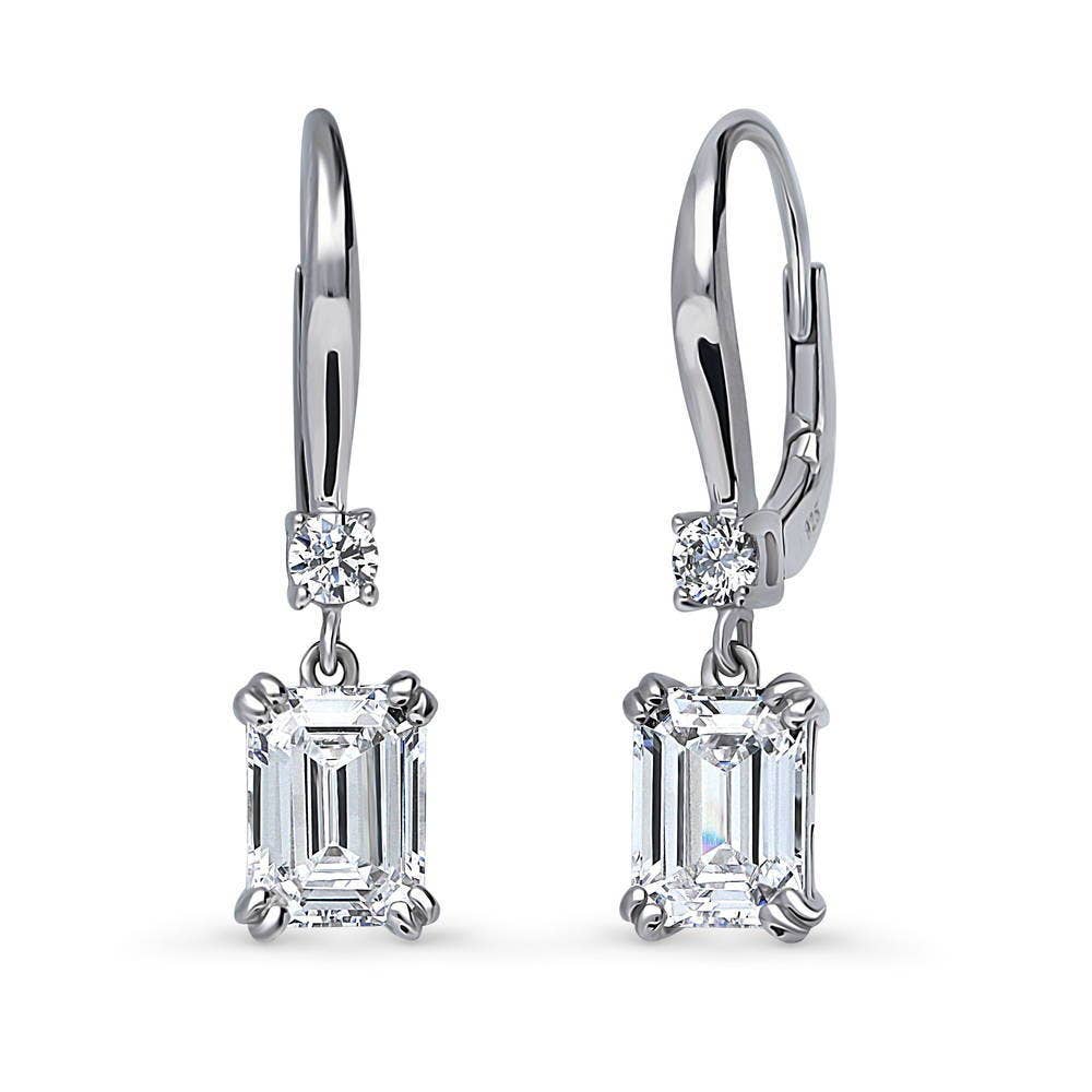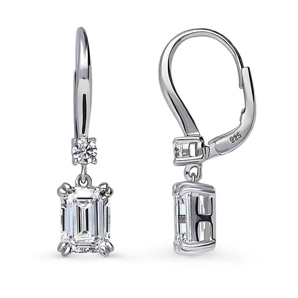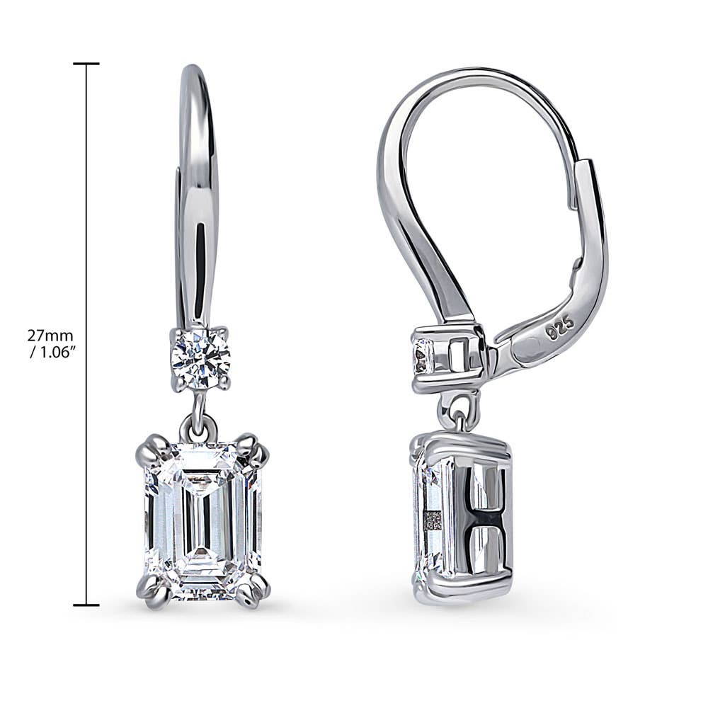 Main stones feature 3.4 carat total (1.7ct per earring) emerald cut cubic zirconia (8mm x 6mm) in prong setting. Accented with 0.22 ct.tw round CZ (3mm) in prong setting. Earring measures 1.06"(L), 0.25"(W). Leverbacks.