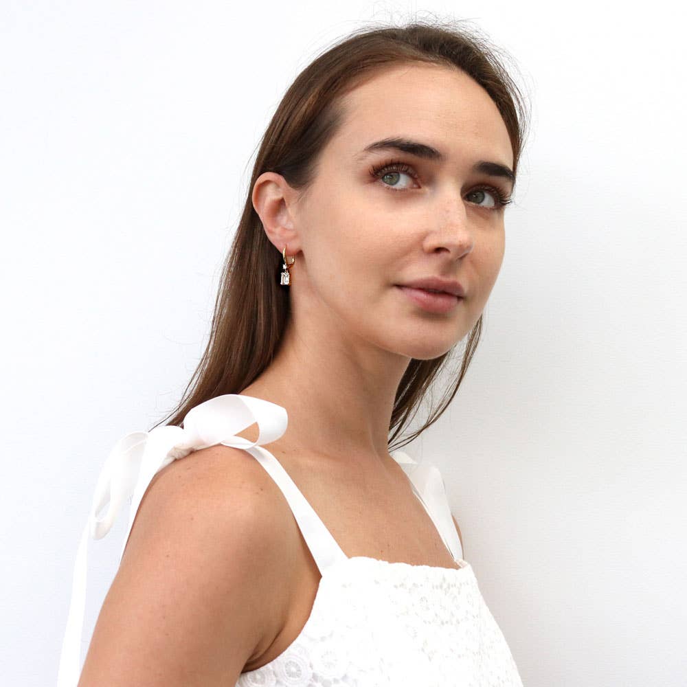 These solitaire with side stone dangle earrings feature a small classic round cut and a dangling emerald-cut stone that steals the show. Crafted with fine 925 sterling silver.