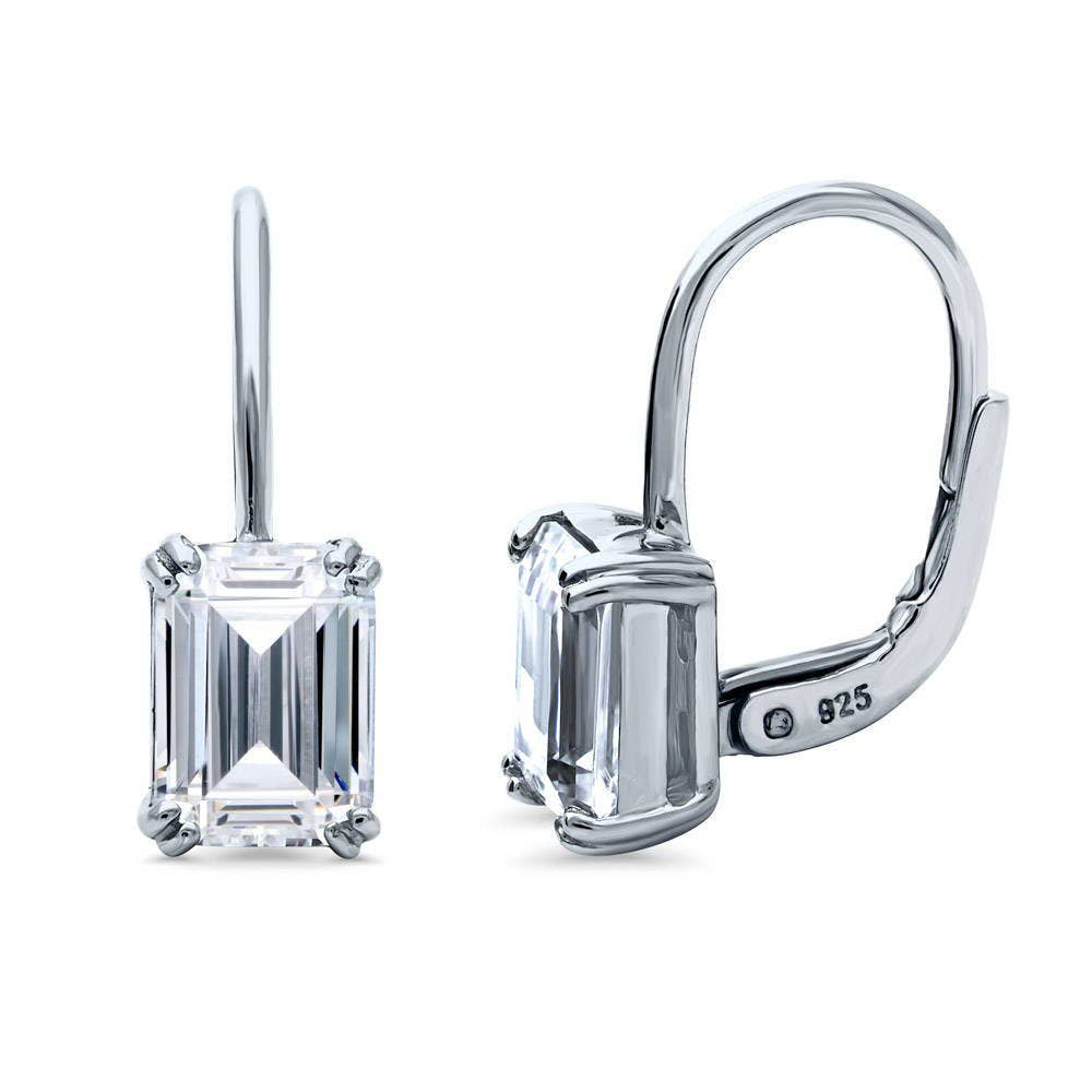 Features 2.4 ct.tw (1.2ct per earring) emerald cut cubic zirconia CZ (7.5mm x 5.5mm) in prong setting. Earring measures 0.65"(L), 0.22"(W). Leverbacks. (EARRINGS 2) Features 2.4 ct.tw (1.2ct per earring) emerald cut cubic zirconia CZ (7.5mm x 5.5mm) in prong setting. Earring measures 0.65"(L), 0.22"(W). Leverbacks.
