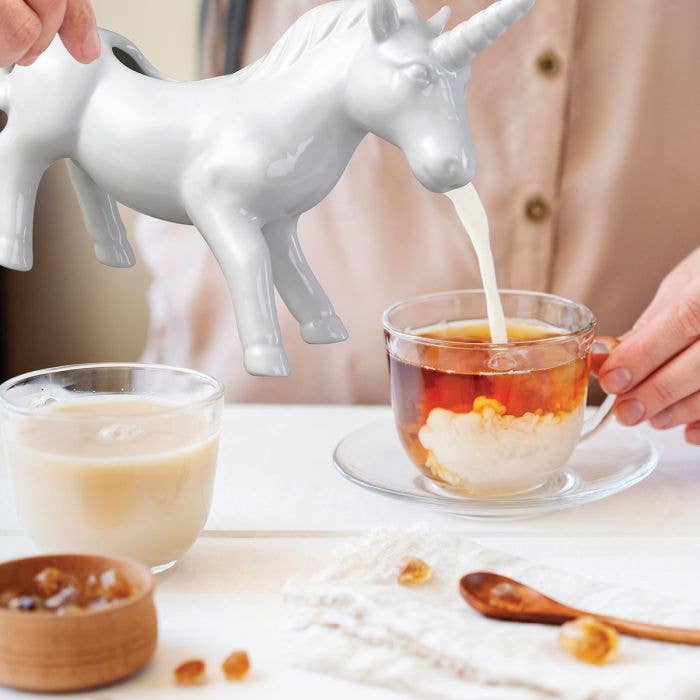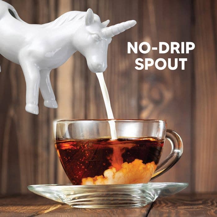 Kitchen's Fine Porcelain Unicorn Milk Creamer Dispenser adds magic to any table for serving cream and milk at every coffee and tea service, or for hot chocolate, spiced cider, warm milk and honey, and other favorite beverages. The drip-free spout makes pouring mess free and saves tablecloths from stains. It's perfect for serving cream and milk, and works great for salad dressings, too. It performs equally well for hot or warmed contents, like hot maple syrup, drawn butter, au jus, and gravies. The easy-hold handle offers a comfortable grip during use and keeps fingers away from hot contents. It's great as gifts for tea lovers, or hostess gifts and coffee gifts for at-home baristas.