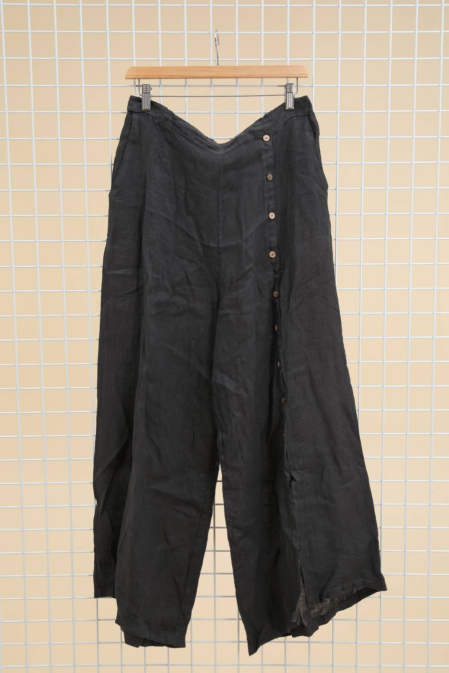 The cut is straight and loose, with buttons on the left side, offering comfort and freedom of movement. The pants have two practical side pockets. One Size fits 10-16