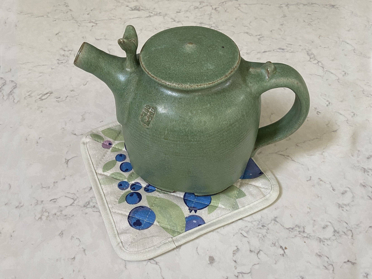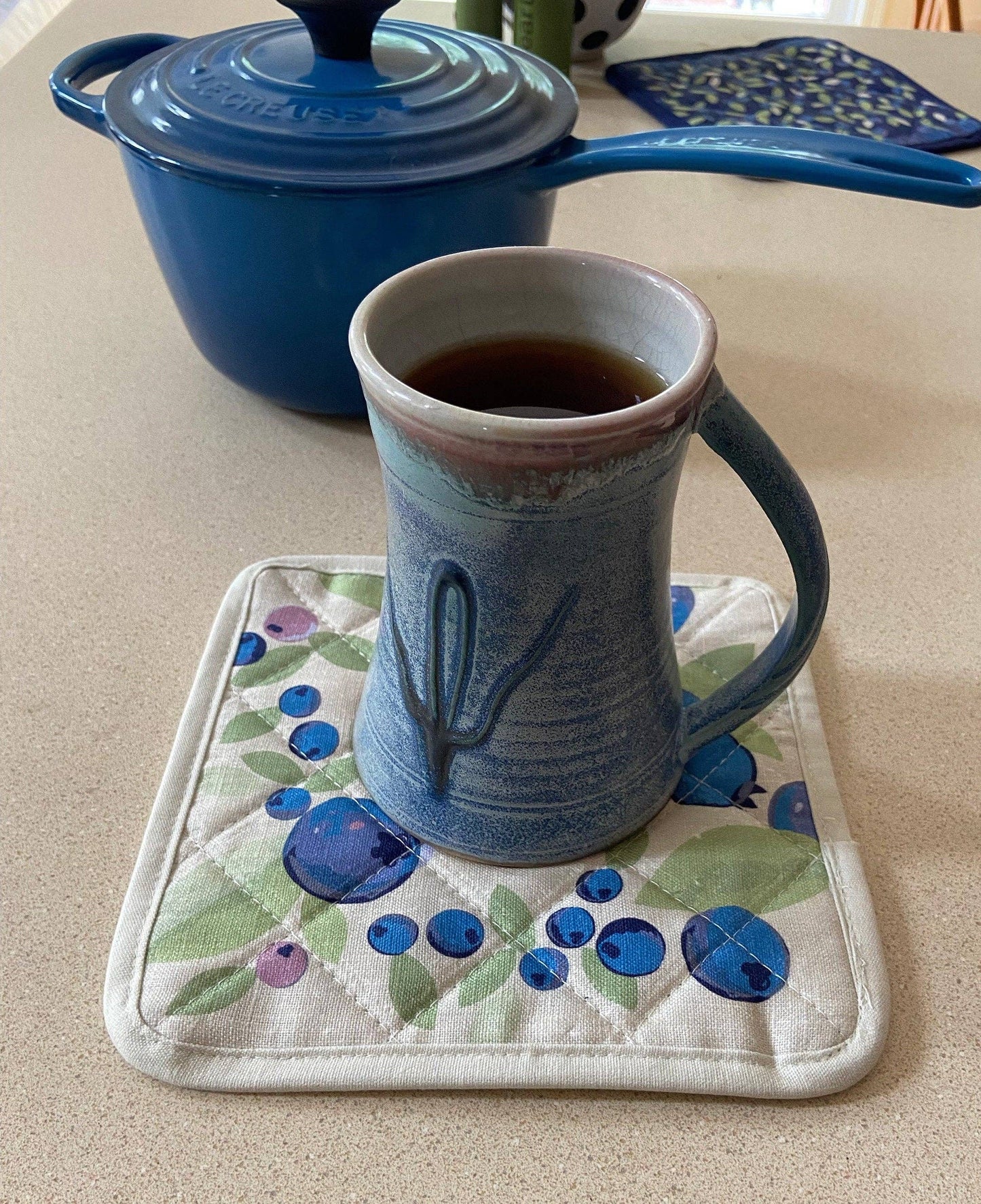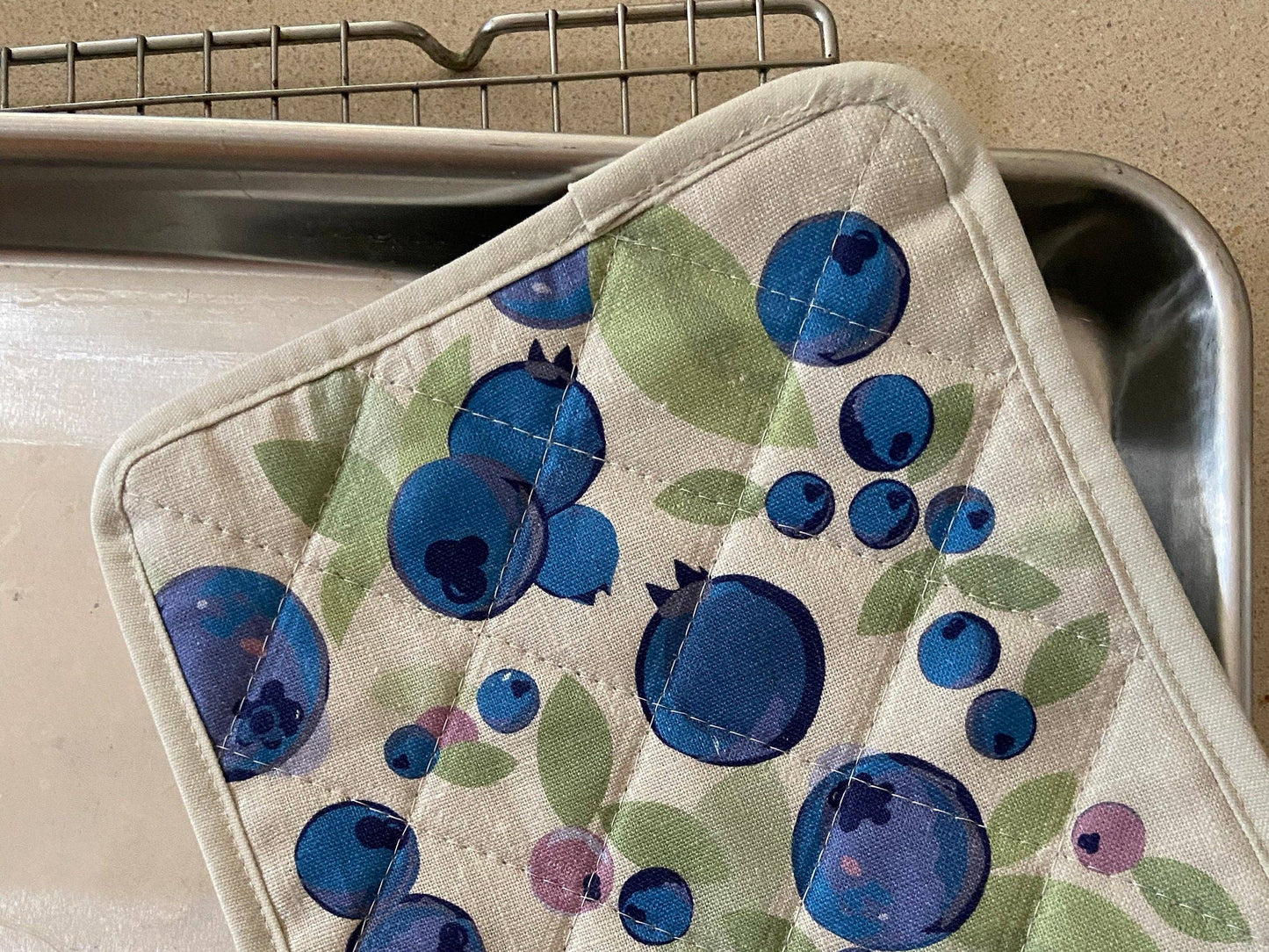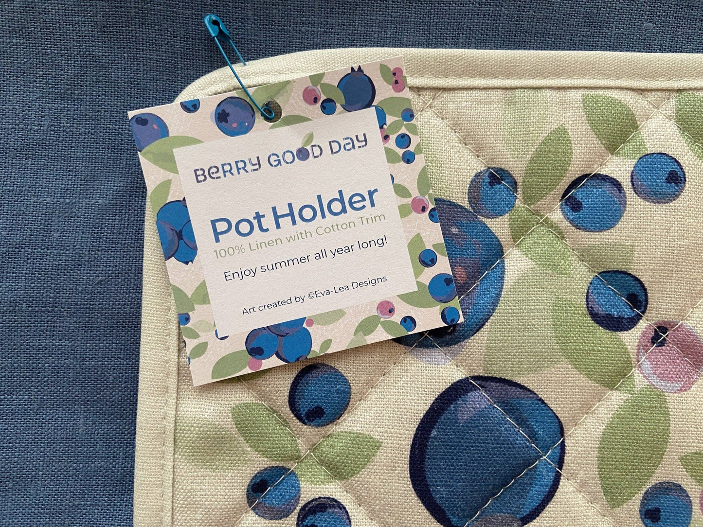 Enjoy the sweetness of summer blueberries all year long! This 100% linen pot holder with sturdy cotton trim is covered in big bold blueberries. Bring back memories of summer all year long. It’s both useful and unique! The sturdy, lint-free fabric softens with each wash but the colors stay rich and vibrant. Add some fun functional art to your home, cottage, or cabin decor. Add to a blueberry themed gift basket. Fits well into a suitcase.